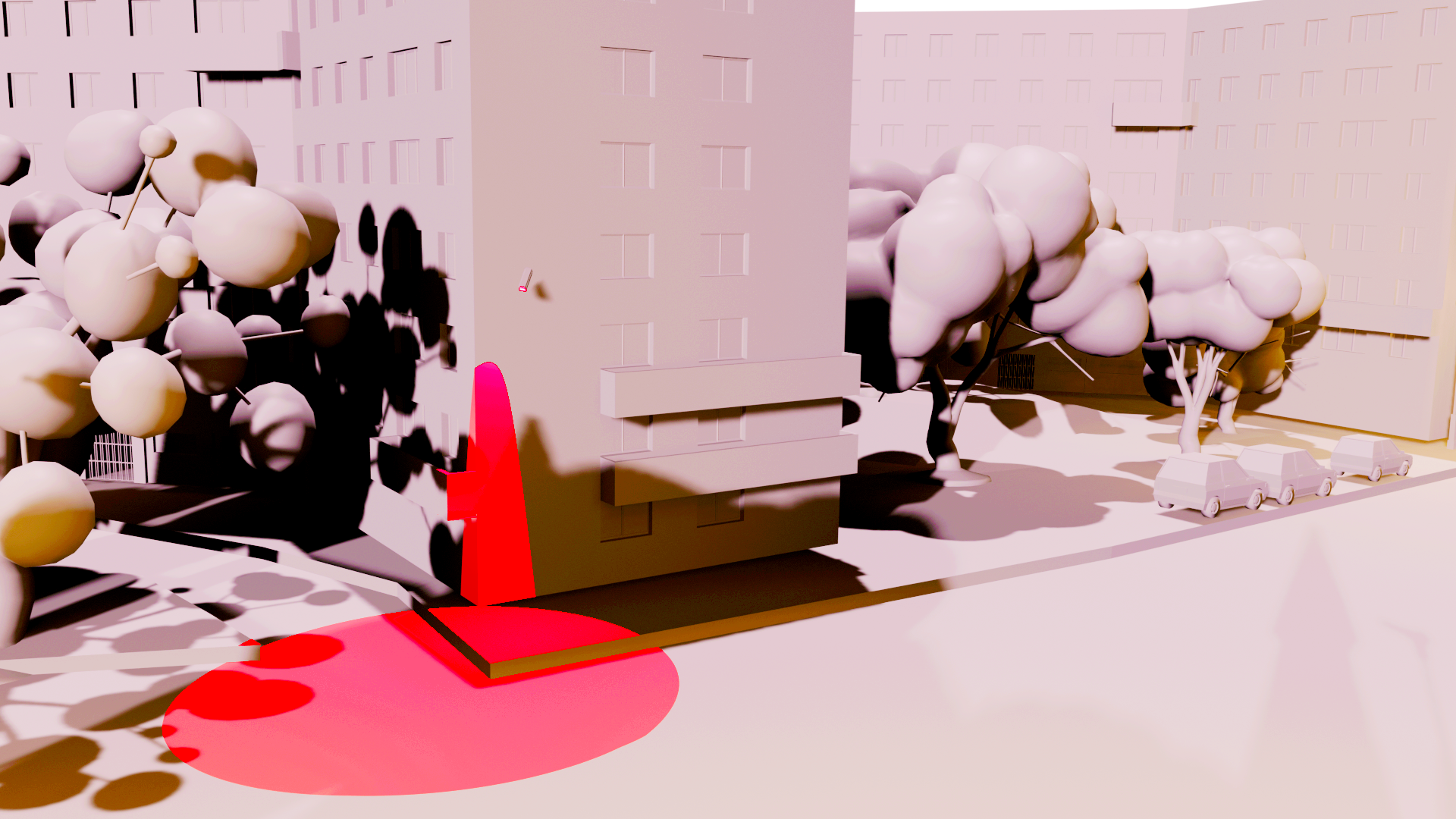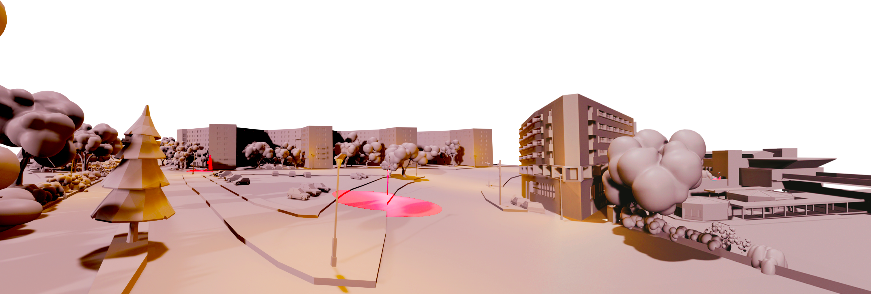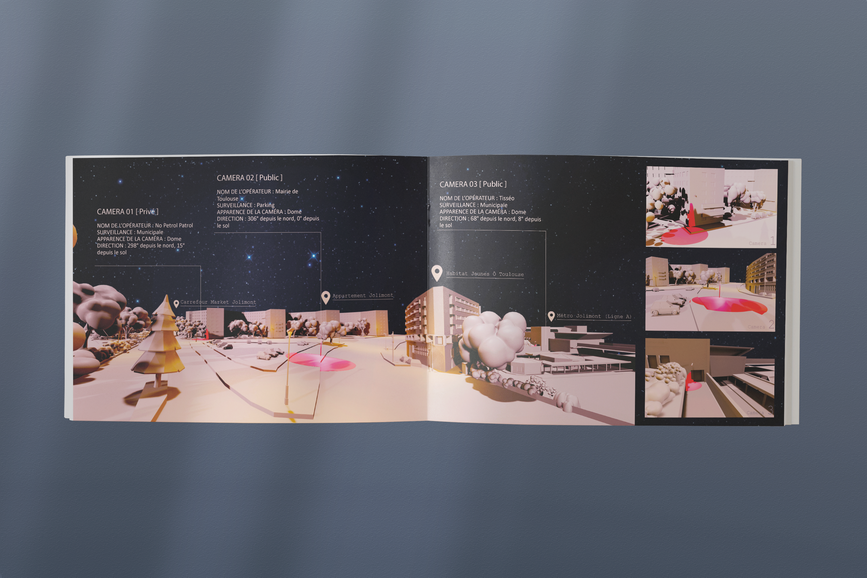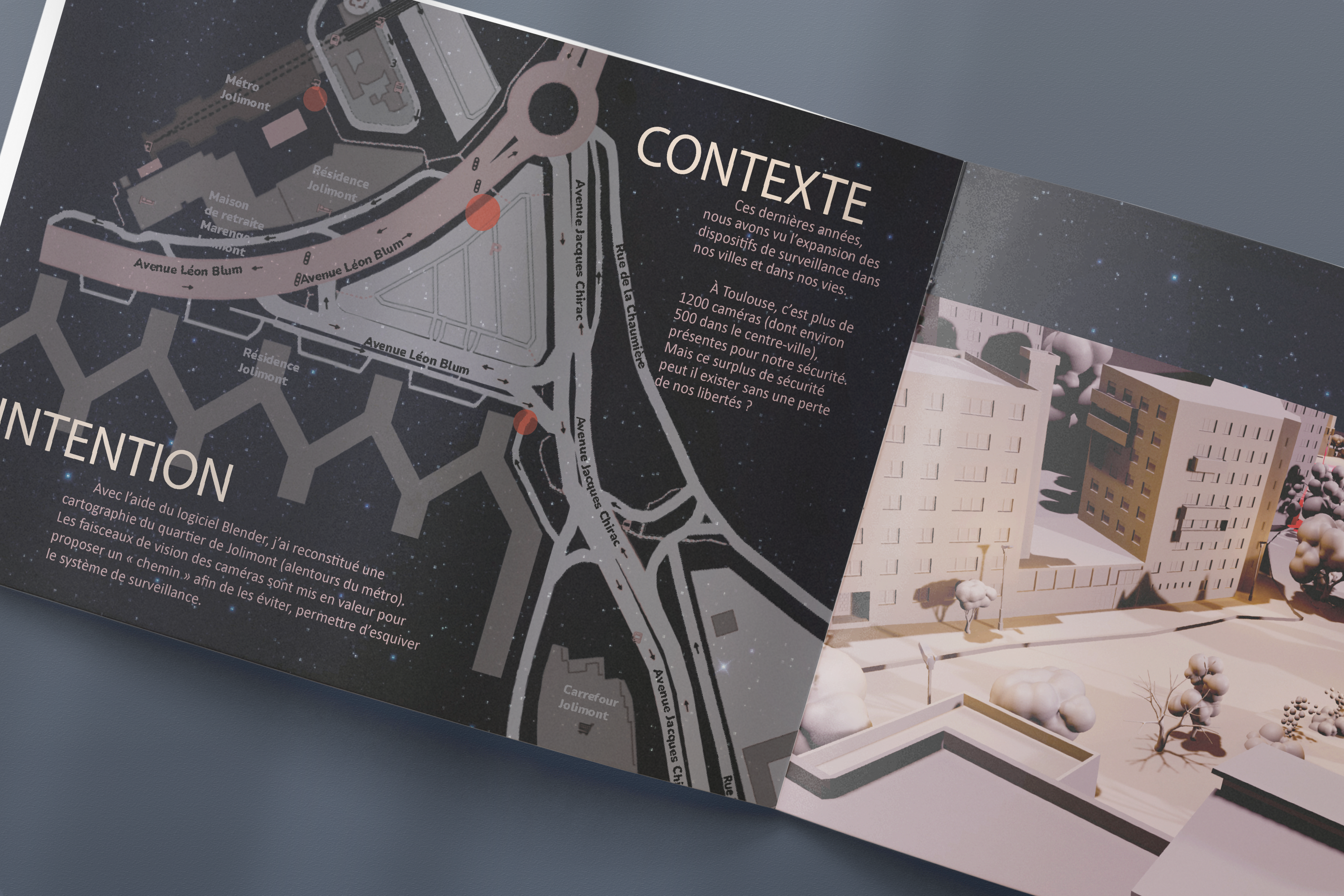 À l’aide du logiciel Blender, j'ai réalisé une cartographie 3D détaillée du quartier de Jolimont où j’habite. La position et la vision des caméras sont représentées par des faisceaux rouges, ce qui permette de trouver un chemin afin d’esquiver le système de surveillance.