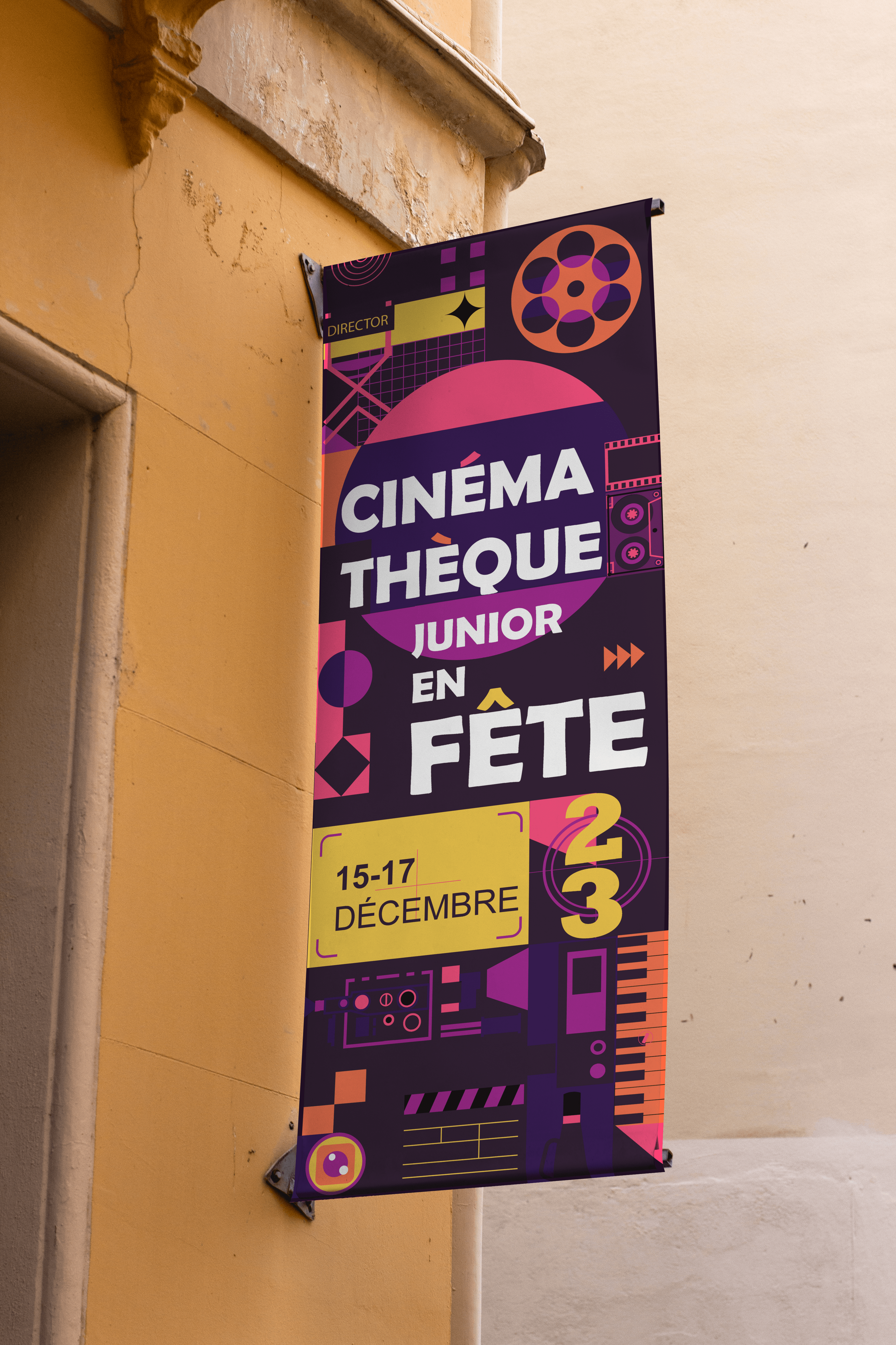 Réaliser un système graphique (affiches adhésives, programme, et supports web) pour évènement La Cinémathèque Junior en fête proposé par La Cinémathèque de Toulouse, du 15 au 17 décembre 2023.