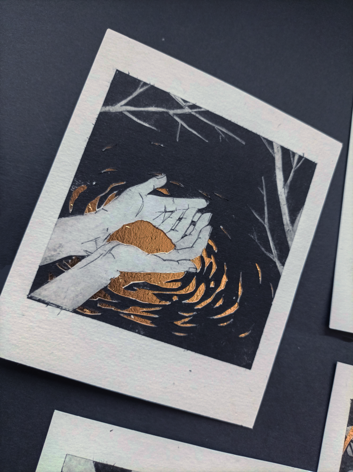 Réalisation une série d'illustration inspirée par "l’Histoire comique des États et Empires de la Lune" - une nouvelle initiatique relatant un voyage imaginaire sur la Lune écrite par Cyrano de Bergerac en utilisant les techniques liées à l’art de l’imprimerie (gaufrage/monotype intaglio).